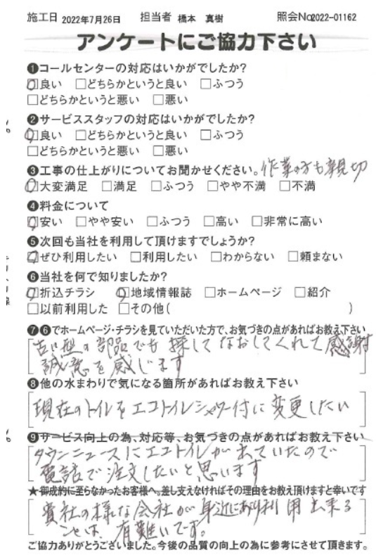 この度は三和水道管理をご利用いただきましてありがとうございます。トイレのご交換も承っております。また時機が来ましたら弊社にご依頼頂けますとうれしいです。いつでもご連絡お待ちしております!