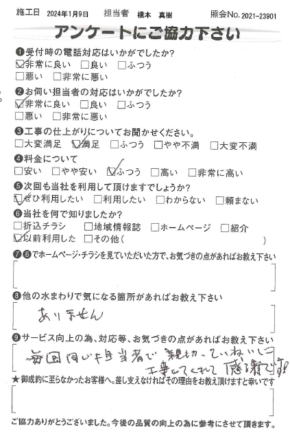 この度は三和水道管理をご利用頂きましてありがとうございました。顔を覚えてもらえていましてうれしく思います。ありがとうございます。何かの際には、対応させていただきますので、よろしくお願いいたします。