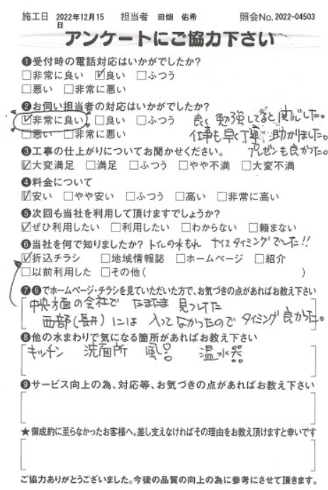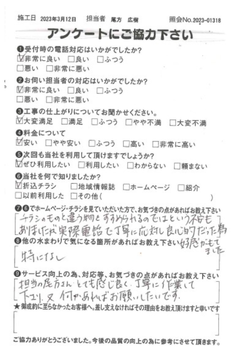 この度は三和水道管理のご利用頂きましてありがとうございました。お客様のご要望に沿ったご提案をさせて頂いております。施工の面に関しましても丁寧さを評価いただきましてありがとうございました。