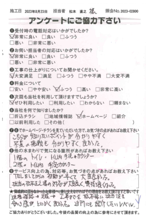 TELをしてからの初動が早くて大変良かった。担当の松本直之様の対応が大変良く気持ちよくなった。現場確認→見積→工事までを松本様に担当頂き安心感がとにかく良かった。近所にも紹介したいレベル。