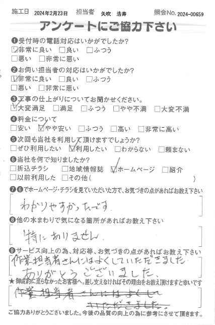 この度は三和水道管理をご利用頂きましてありがとうございました。ご満足いただけましたようで、良かったです。水まわりの事で何かございましたら、お気軽にご相談くださいませ。この度はありがとうございました。