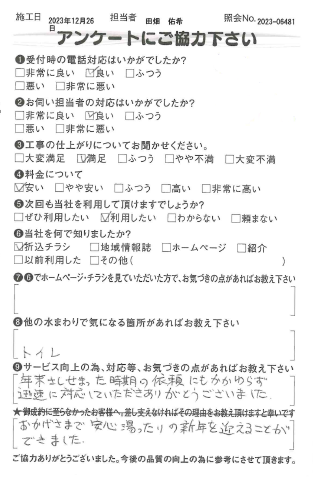 この度は三和水道管理をご利用頂きましてありがとうございました。なるべくお客様にお待たせすることがないように早めに動いております。また、何かございましたら、お気軽にご連絡くださいませ。