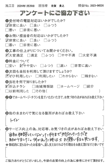 この度は三和水道管理をご利用頂きましてありがとうございました。水まわりの事でしたらどんなことでもご相談くださいませ。また、何かの際はよろしくお願い致します。