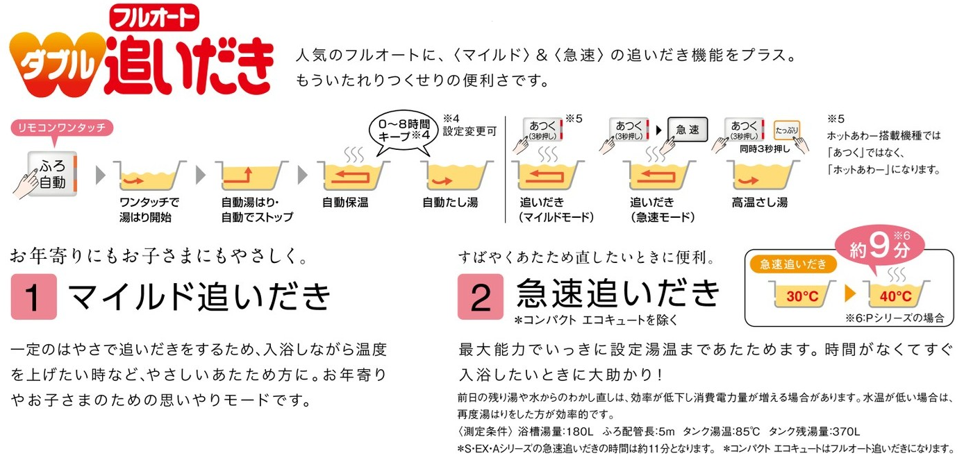 ・ホットあわー・キラリユキープPLUS・バブルおそうじ・ホットりたーん・お急ぎ湯はり・サーモジャケットタンク・パカっとハンドル・フルオートW追い焚き・自動お湯はり・自動保温・自動たし湯・追い焚き/急速追い焚き・学習機能(過去2週間分の使用状況を学習)・ツイン湯温コントロール・アシスト湯はり/ヒートポンプ保温・給湯ガイド・節電モード・防汚コート(ヒートポンプユニットは除く)・本体カラー:モダングレー