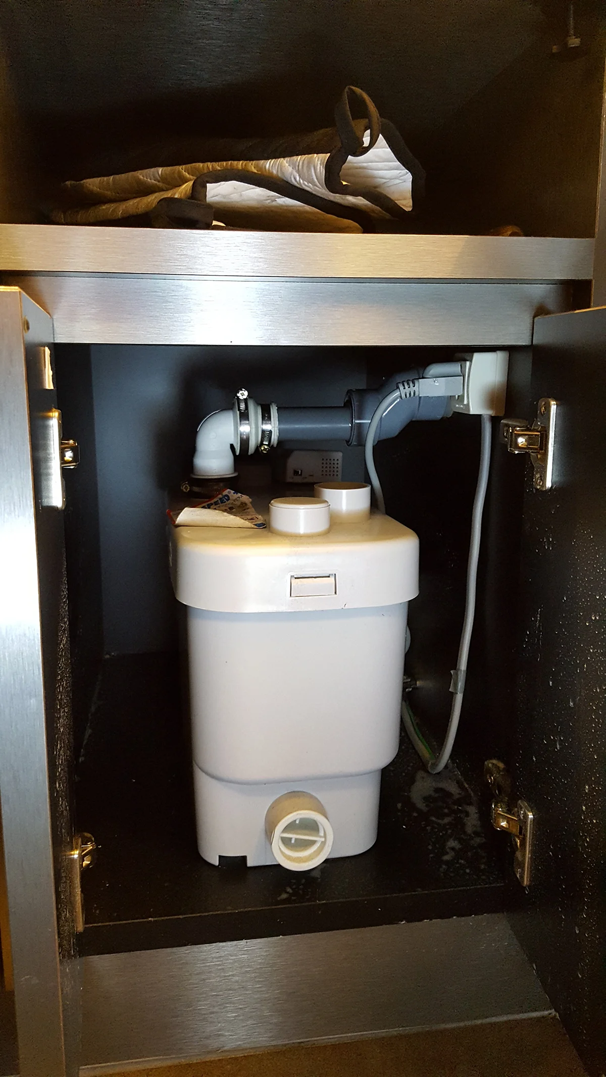 駅改札内にコンビニ開設するにあたり手洗いを設置したいが、排水設備が無く、床SLVコア抜きによる階下排水も不可能。