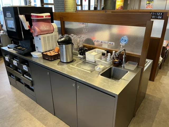 店舗フロアー中央にドリンクバーを設置する計画を立てたが、ドリンクバーの排水を流すための排水管を適切な勾配で設置することが不可能であった。