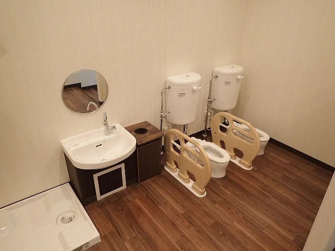 SFAポンプ(サニアクセス3)を用い、幼児用便器、手洗い器、洗濯機、調乳室のシンクからの排水は天井懐まで垂直に、その後横引きし、PS内の既存の排水立て管へ圧送しています。コストと納期を抑えながら、子供たちと保育士のことを第一に考えた水まわりレイアウトが実現できました。