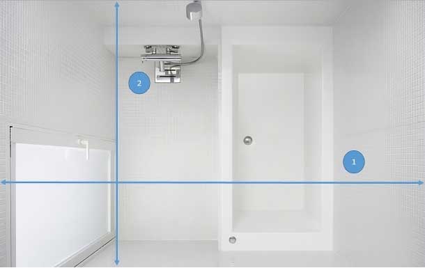 1(浴室の幅)、2(浴室の奥行き)の2辺の長さを測ります。