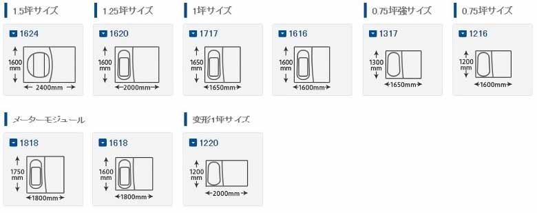 システムバスのサイズ表示は、どちらのメーカーのユニットバスでも1216・1616・1620などと表現します。(例:TOTOサザナ S-TYPE1216)これは浴室の内径の幅・奥行きを略して表したもので、120cm×160cmのスペースを1216と表現します。